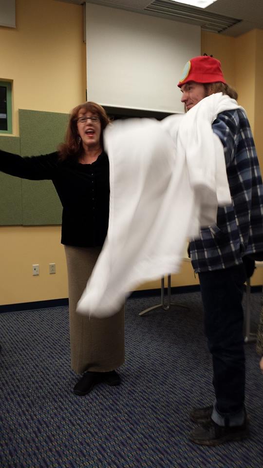 Daniel with the presenter volunteering for a demonstration at the library training 10 Ways for Children to Tell Stories 2015